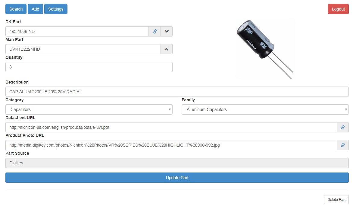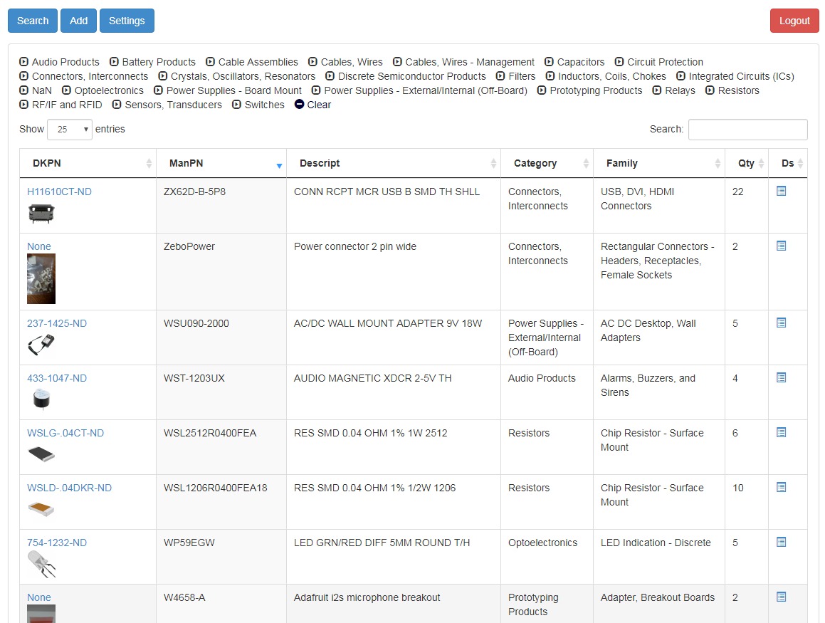 Written with NodeJS and Express, this application ingests electrical parts (and any other part) files with a companion Android App. It as the ability to scan barcodes, such as the ones on a DigiKey or Mouser Part bag and return all of the vital information, including part number, picture, description, manufacturer, datasheet, and more. If it is a part without a barcode, you can enter the information yourself along with a photo the phone captures. The parts are then searchable and include the quantity, making it easy to track my parts.